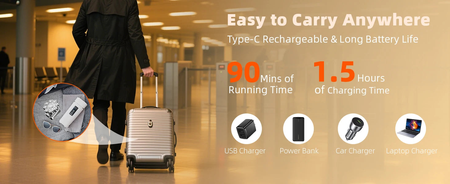 This electric razor for men is equipped with an LED smart display, which displays the remaining usage time, low battery reminder and cleaning reminder in real time, so that you can always keep track of the status of the head shaver. It only takes 1.5 hours to quickly charge and can be used continuously for up to 90 minutes. The charging method is flexible and diverse, compatible with laptops, cars and mobile power supplies, etc., for your daily use.
